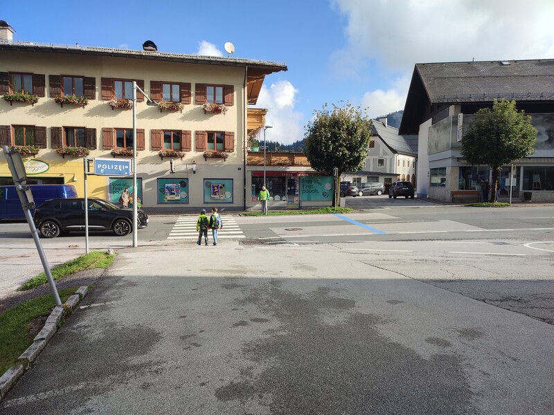 Gemeinsam mit der Polizei Abtenau übten wir das richtige Überqueren der Straße, wie wir uns für Autofahrer gut sichtbar machen können und welche Notrufnummern es gibt.